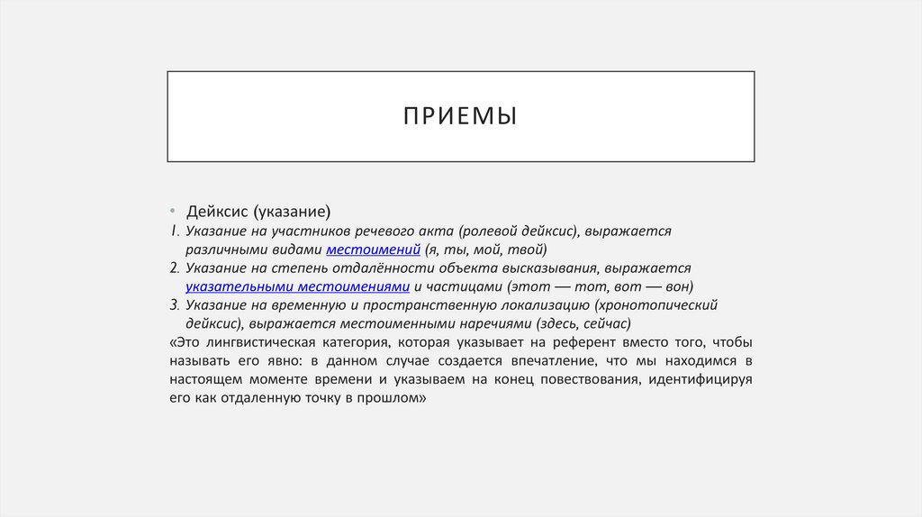 дейксис), выражается местоименными наречиями (здесь, сейчас)