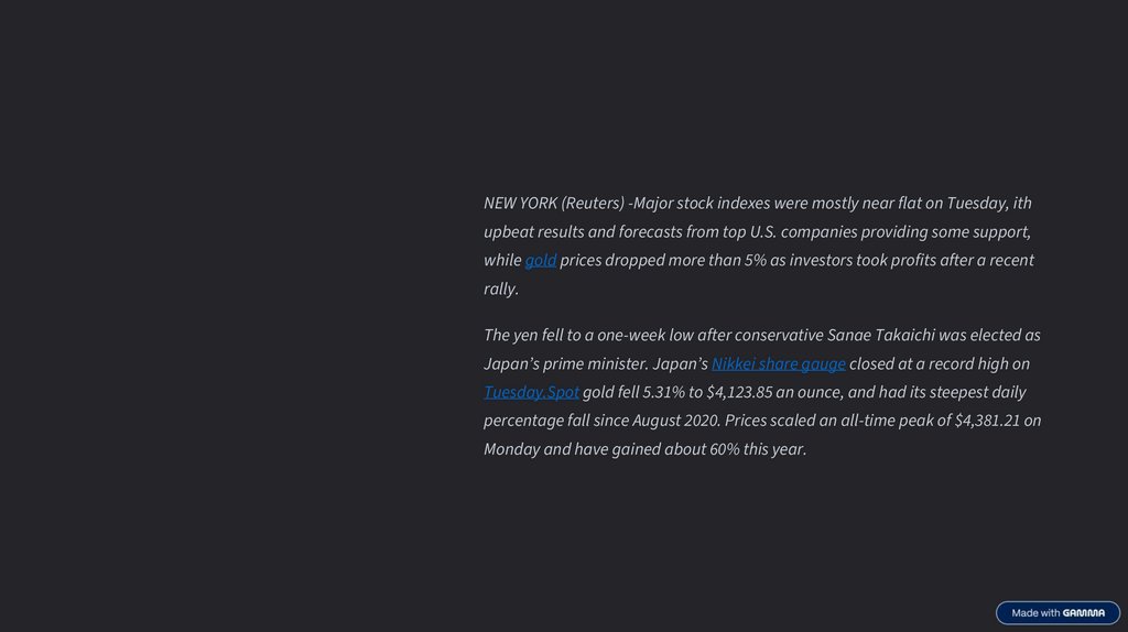 NEW YORK (Reuters) -Major stock indexes were mostly near flat on Tuesday, ithupbeat results and forecasts from top U.S. companies providing some support,