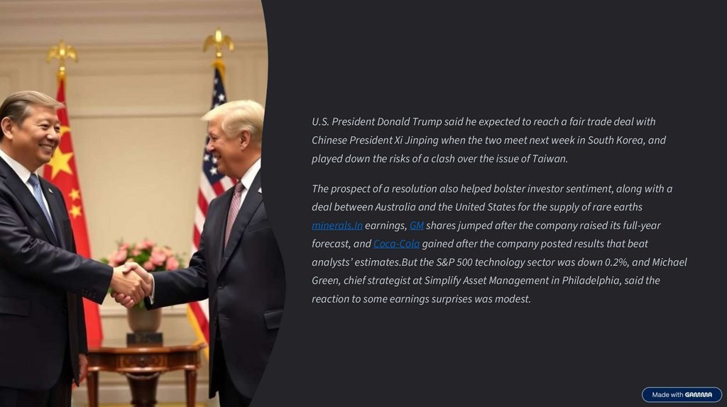 U.S. President Donald Trump said he expected to reach a fair trade deal withChinese President Xi Jinping when the two meet next week in South Korea, and