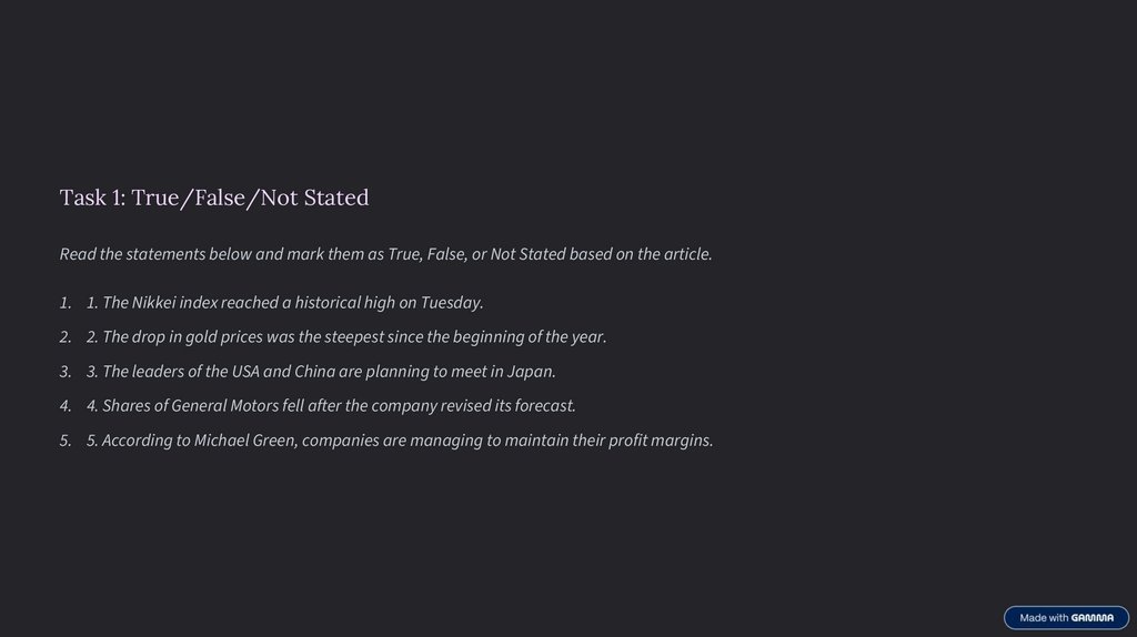 Task 1: True/False/Not StatedRead the statements below and mark them as True, False, or Not Stated based on the article.