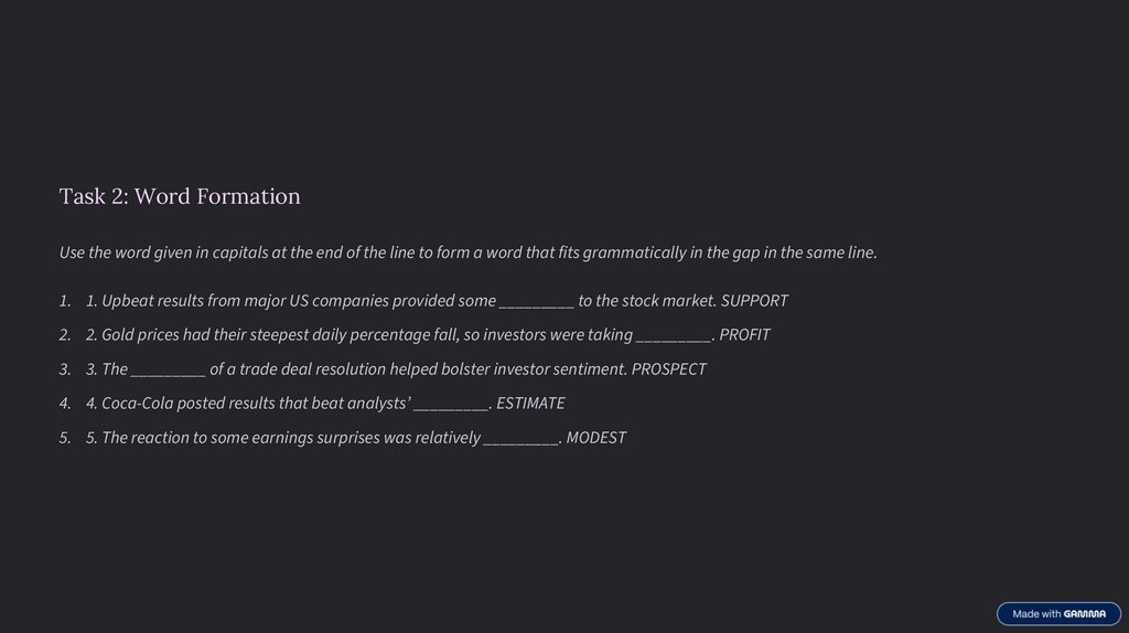 Task 2: Word FormationUse the word given in capitals at the end of the line to form a word that fits grammatically in the gap in the same line.