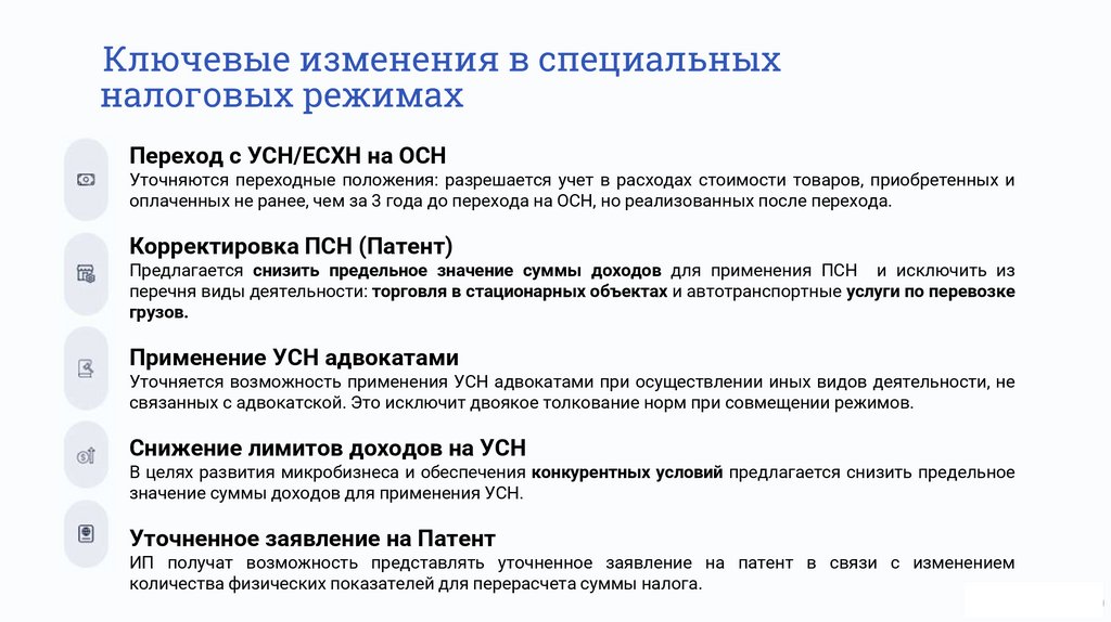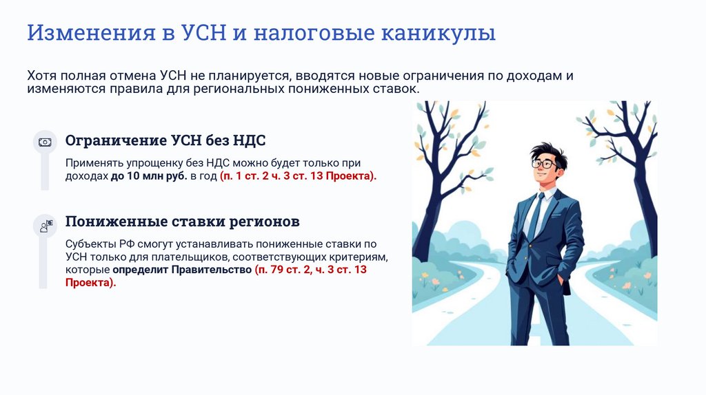 Изменения в УСН и налоговые каникулыХотя полная отмена УСН не планируется, вводятся новые ограничения по доходам и