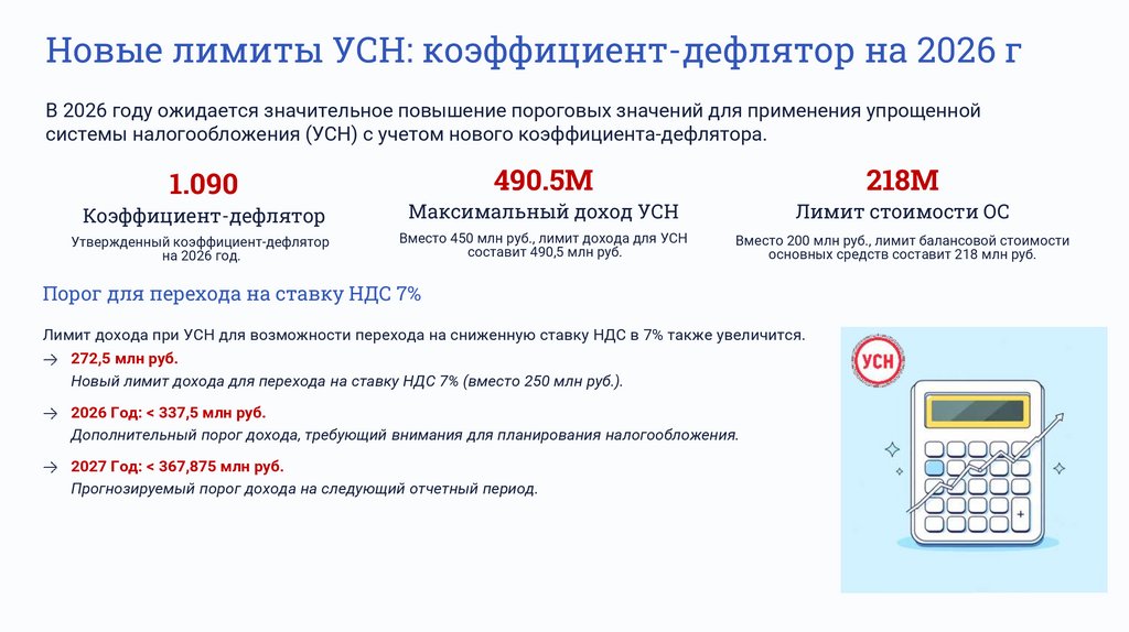 Новые лимиты УСН: коэффициент-дефлятор на 2026 гВ 2026 году ожидается значительное повышение пороговых значений для применения упрощенной