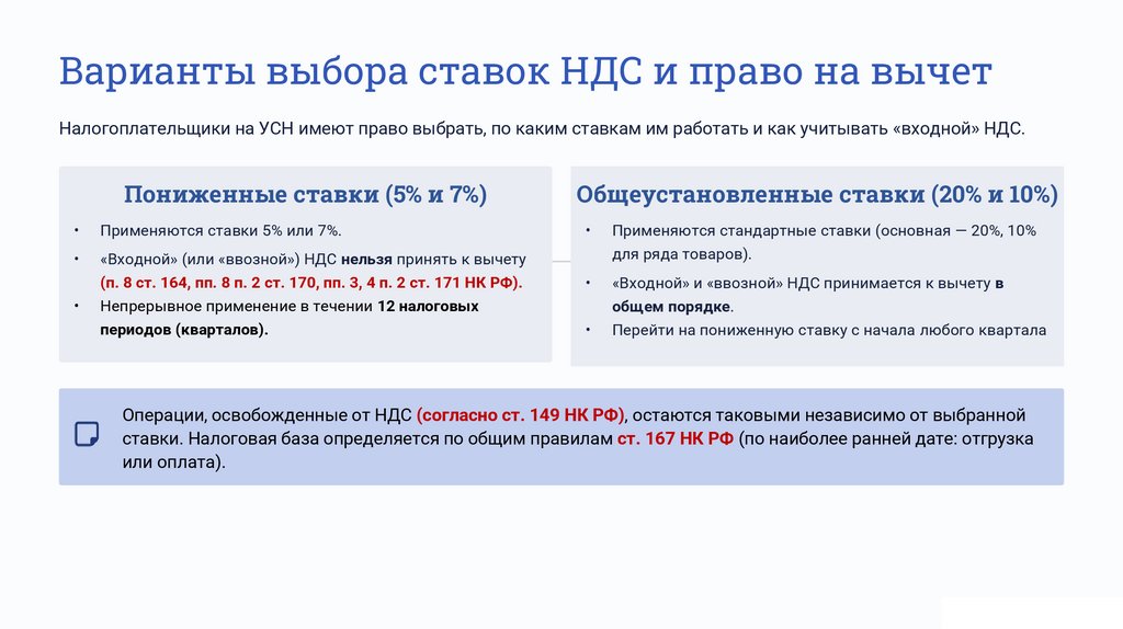 Варианты выбора ставок НДС и право на вычетНалогоплательщики на УСН имеют право выбрать, по каким ставкам им работать и как учитывать «входной» НДС.