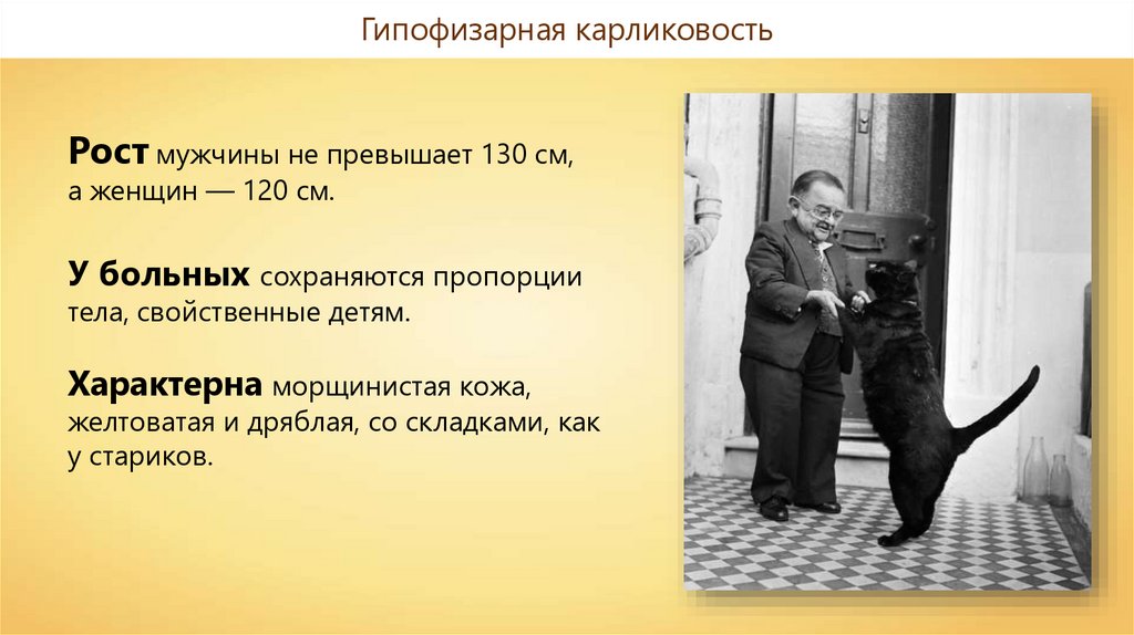 Гипофизарная карликовостьРост мужчины не превышает 130 см,