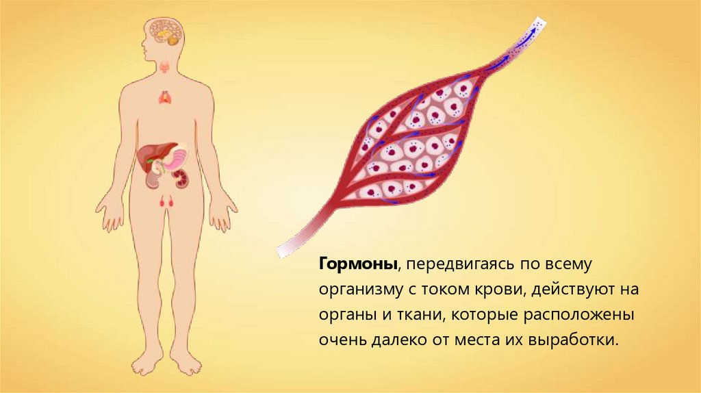 Гормоны, передвигаясь по всемуорганизму с током крови, действуют на