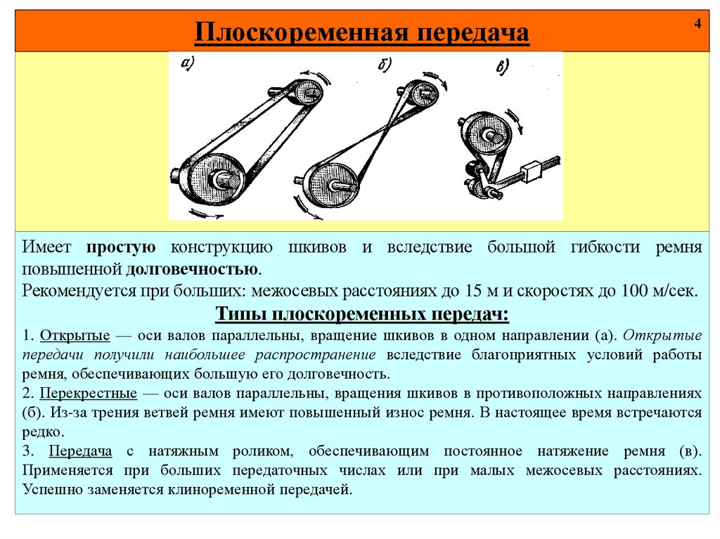 1. Открытые — оси валов параллельны, вращение шкивов в одном направлении (а). Открытые