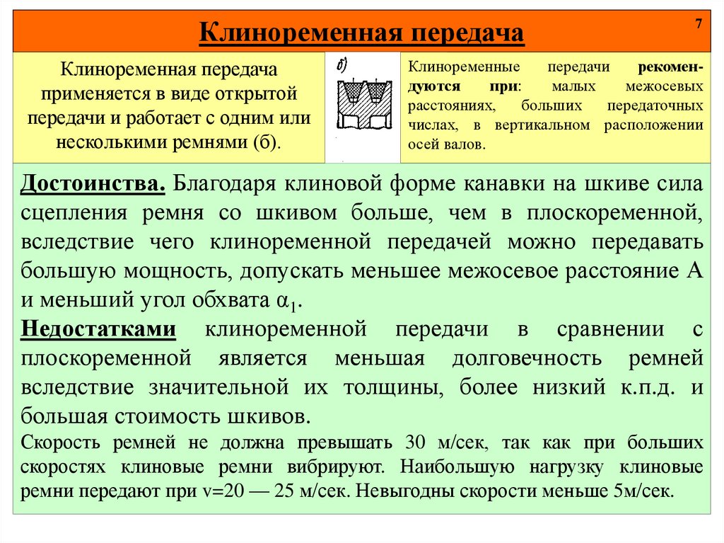 Скорость ремня v=5 - 30 м/сек, а в сверхскоростных передачах может