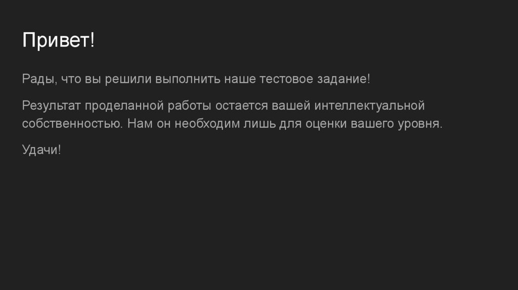 Привет!Рады, что вы решили выполнить наше тестовое задание!
