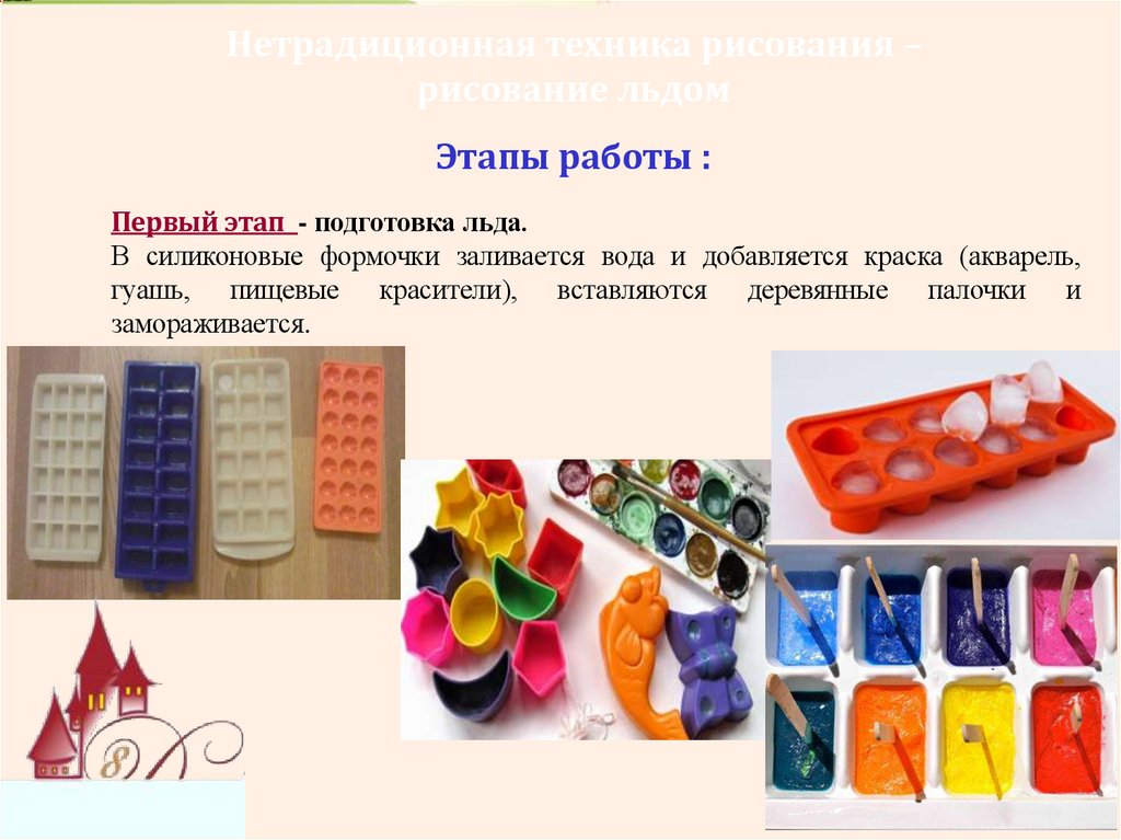 В силиконовые формочки заливается вода и добавляется краска (акварель,