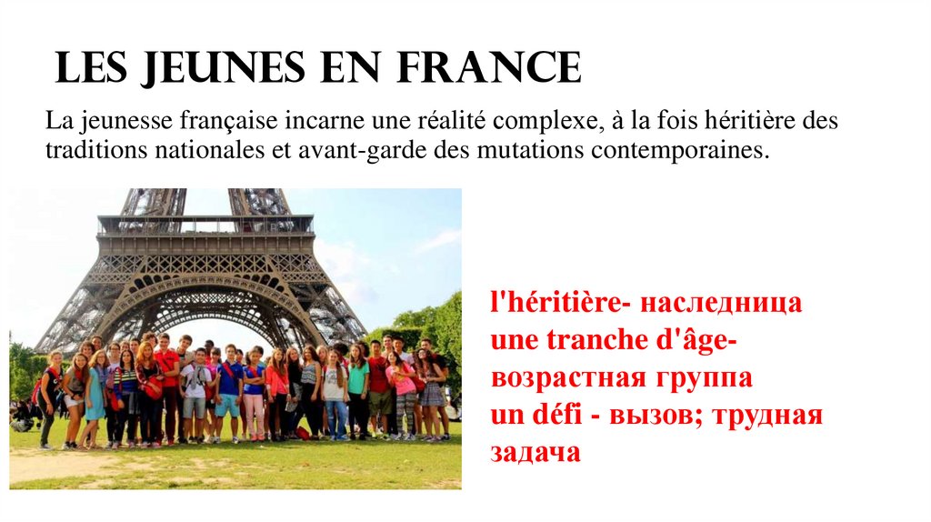 Les jeunes en FranceLa jeunesse française incarne une réalité complexe, à la fois héritière des