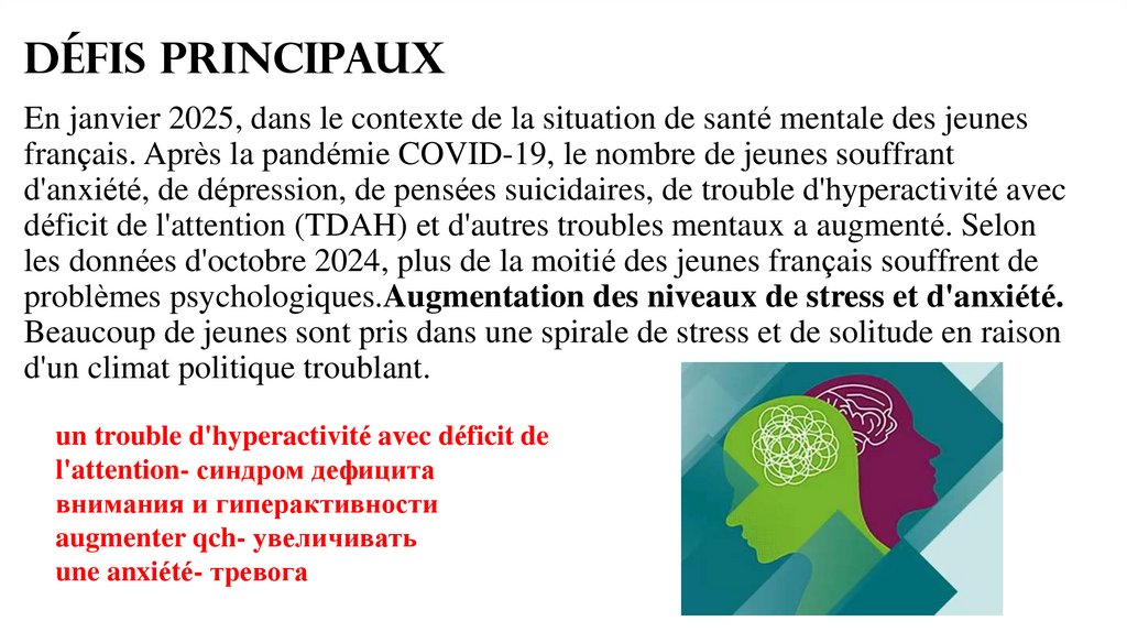 Défis principauxEn janvier 2025, dans le contexte de la situation de santé mentale des jeunes