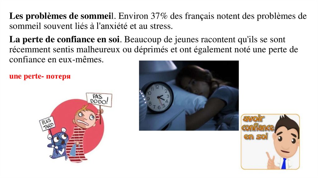 Les problèmes de sommeil. Environ 37% des français notent des problèmes desommeil souvent liés à l'anxiété et au stress.