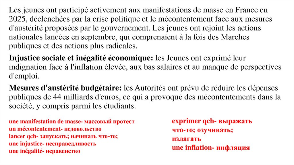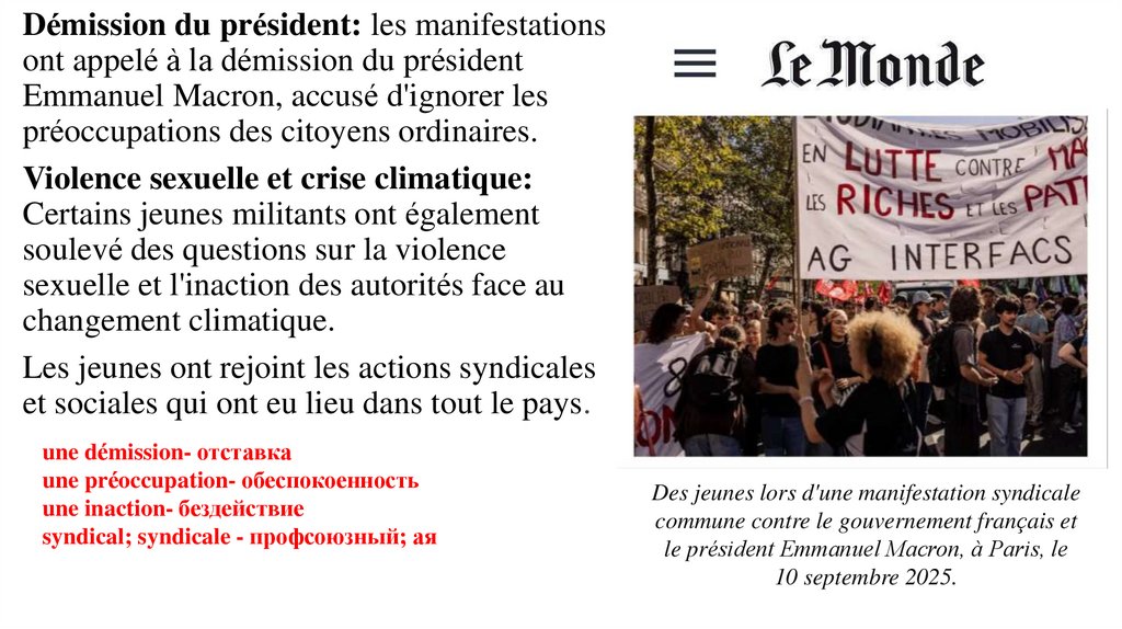 Les jeunes ont participé activement aux manifestations de masse en France en2025, déclenchées par la crise politique et le mécontentement face aux mesures
