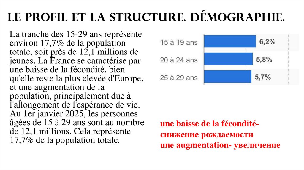 Le profil et la structure. démographie.La tranche des 15-29 ans représente