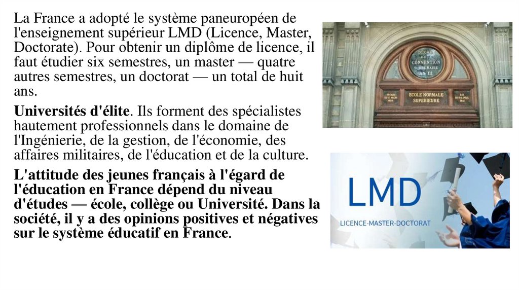 La France a adopté le système paneuropéen del'enseignement supérieur LMD (Licence, Master,