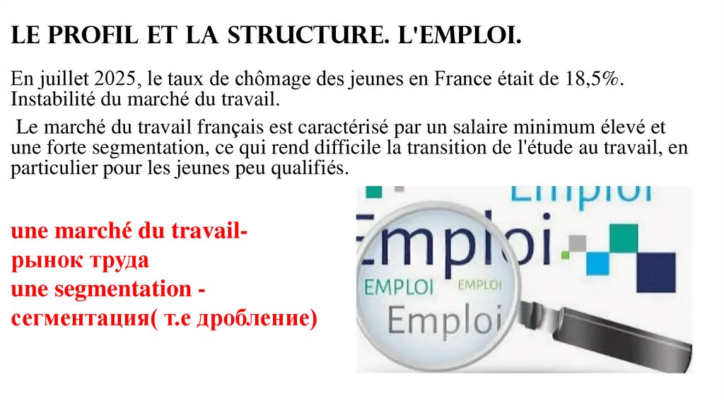 Le profil et la structure. L'emploi.En juillet 2025, le taux de chômage des jeunes en France était de 18,5%.
