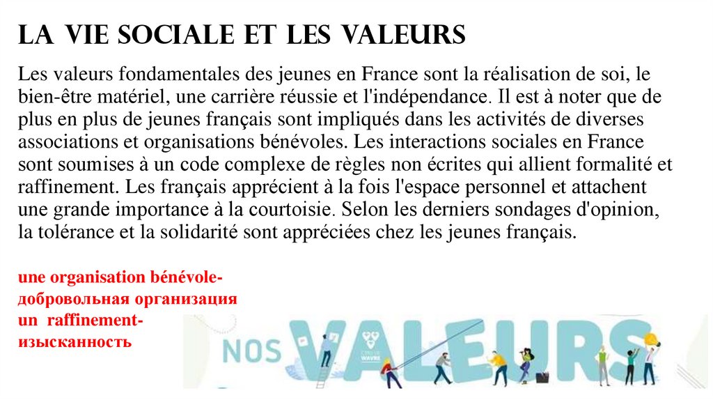 La Vie sociale et les valeursLes valeurs fondamentales des jeunes en France sont la réalisation de soi, le