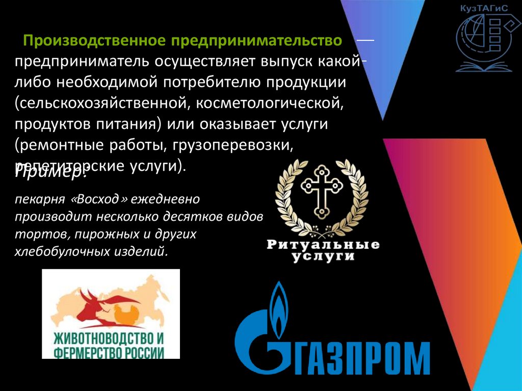 Производственное предпринимательство —предприниматель осуществляет выпуск какойлибо необходимой потребителю продукции
