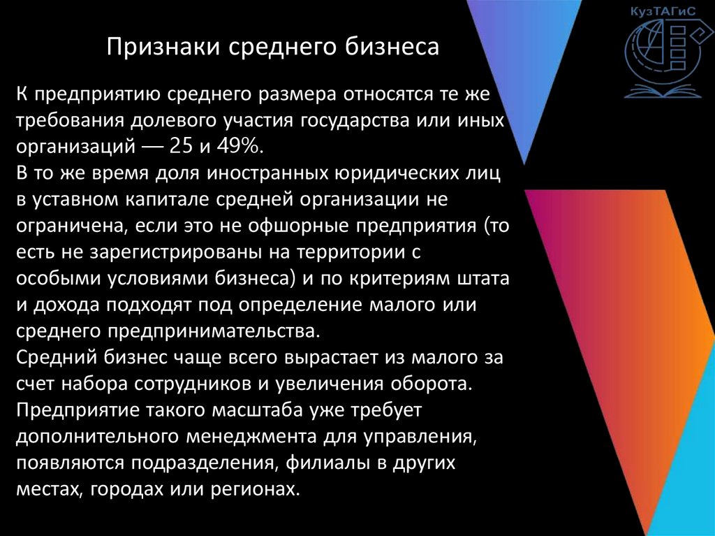 Признаки среднего бизнесаК предприятию среднего размера относятся те же