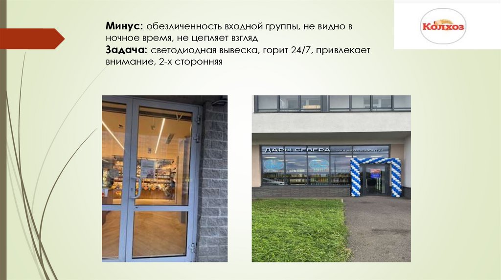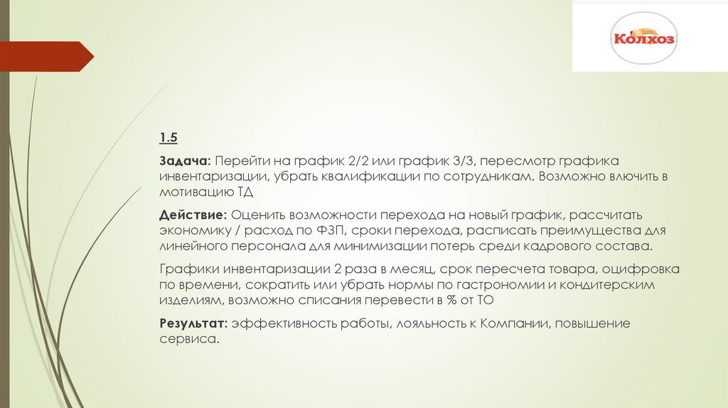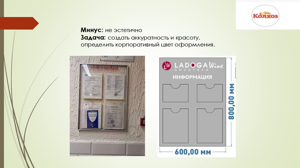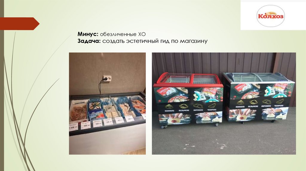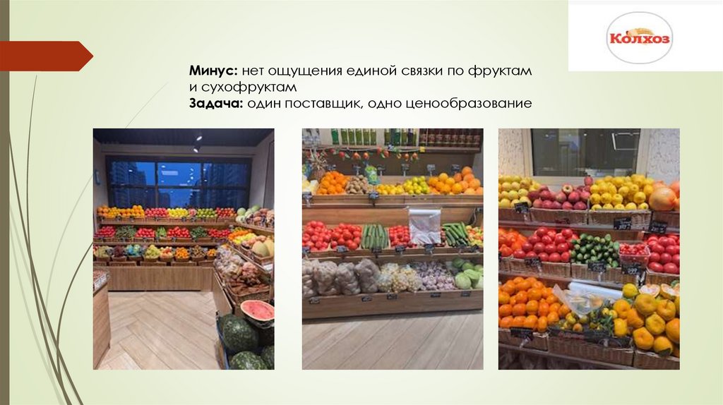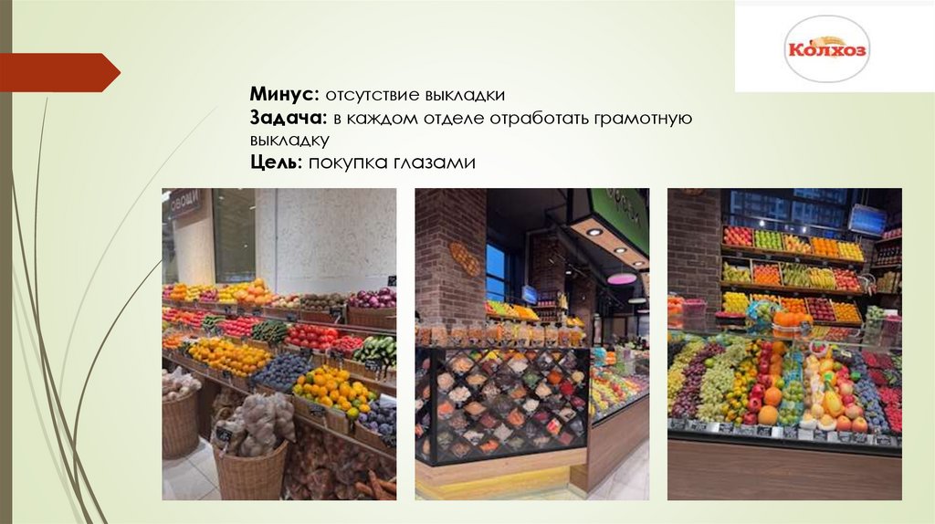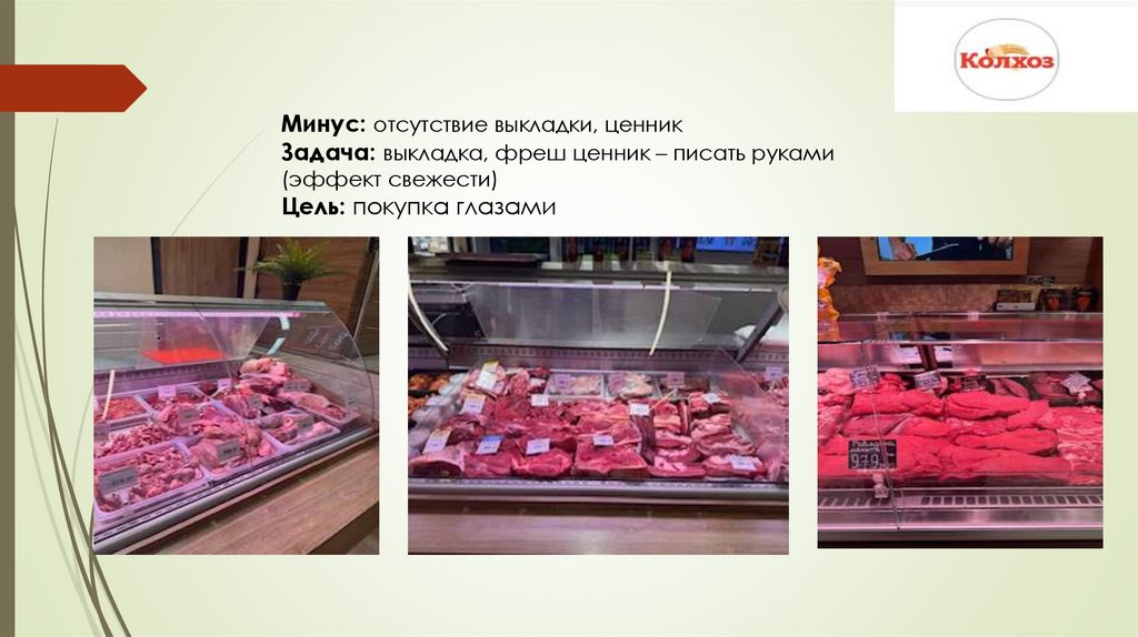 Минус: отсутствие выкладки, ценникЗадача: выкладка, фреш ценник – писать руками
