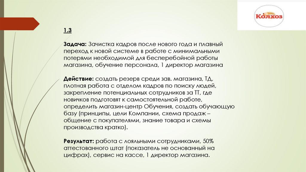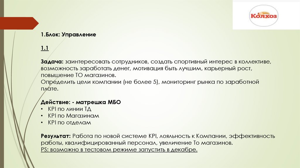 Результат: Работа по новой системе KPI, лояльность к Компании, эффективность