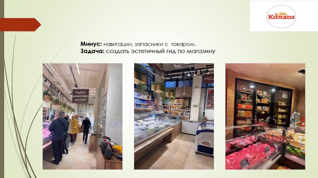 Минус: навигации, запасники с товаром.Задача: создать эстетичный гид по магазину