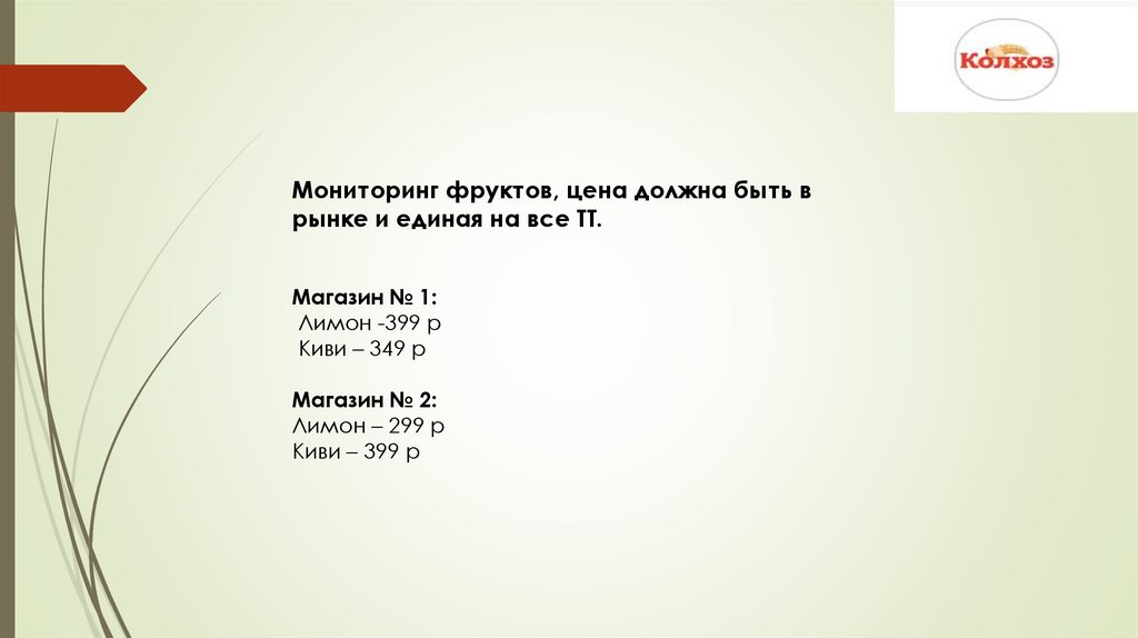 Мониторинг фруктов, цена должна быть врынке и единая на все ТТ.