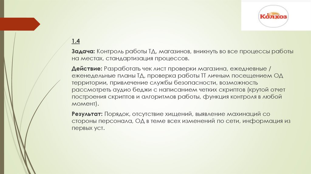 1.4Задача: Контроль работы ТД, магазинов, вникнуть во все процессы работы