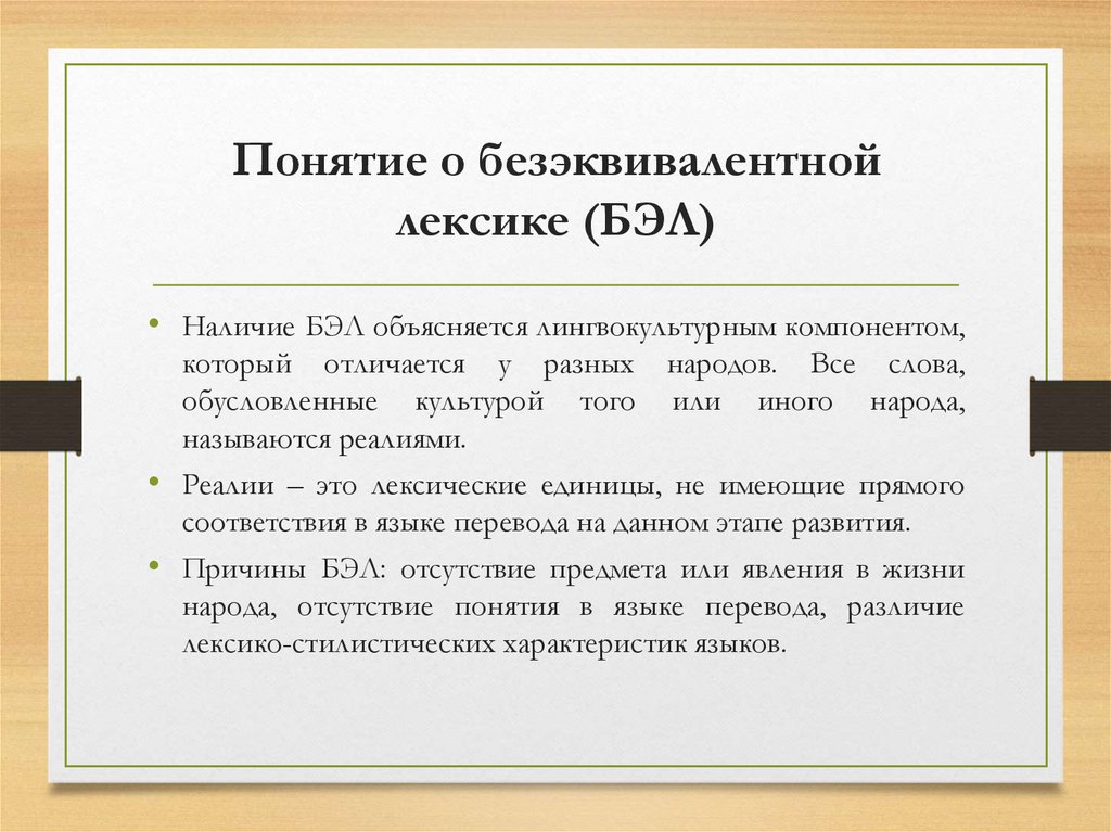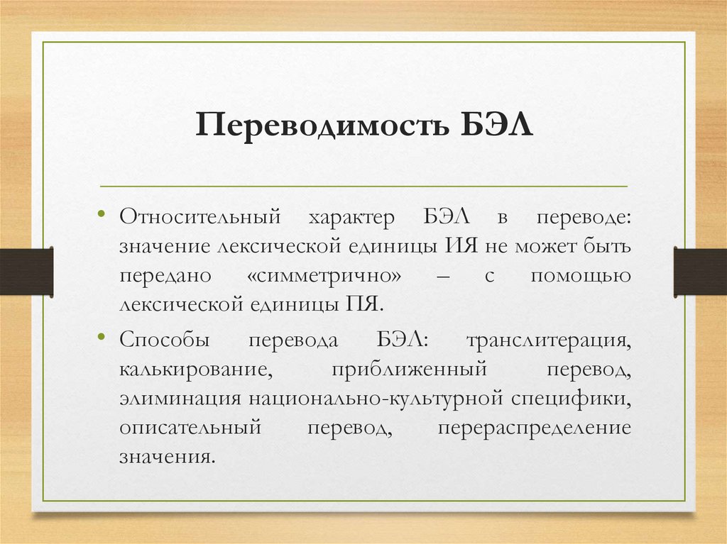 Переводимость БЭЛ• Относительный характер БЭЛ в переводе:
