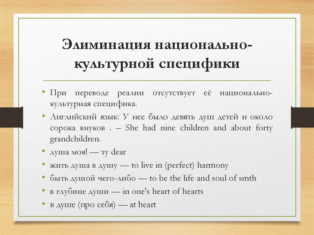 Элиминация национальнокультурной специфики• При переводе реалии отсутствует её национальнокультурная специфика.