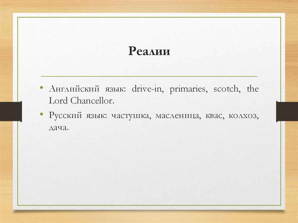 • Реалии – это лексические единицы, не имеющие прямого