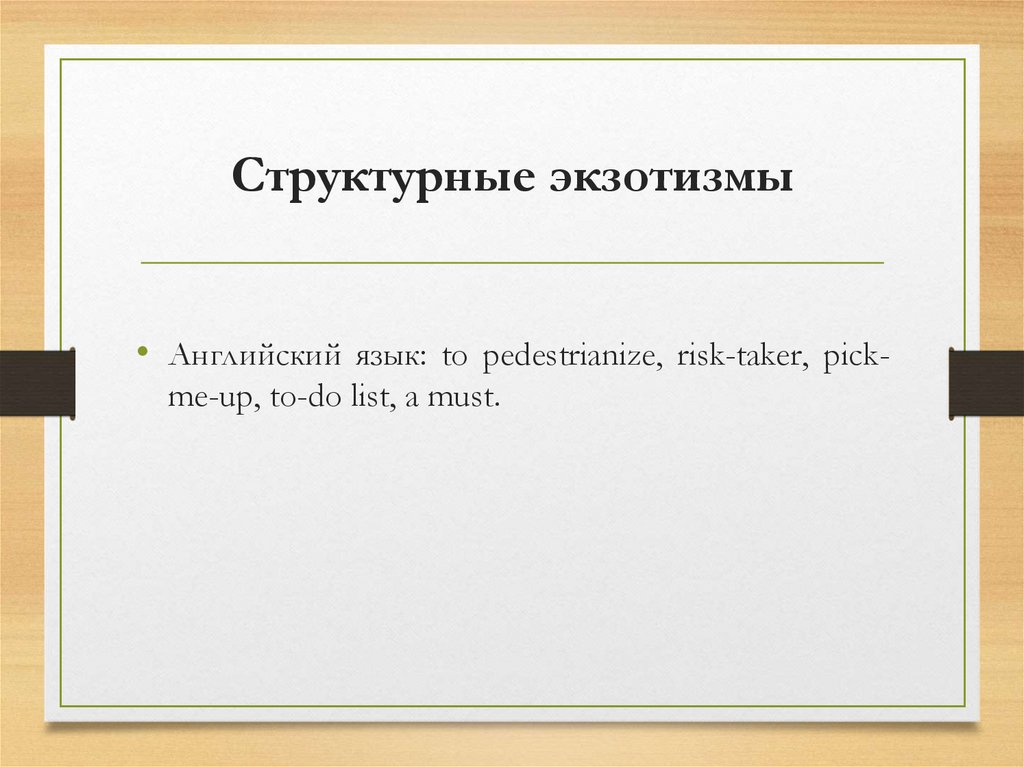 Структурные экзотизмы• Английский язык: to pedestrianize, risk-taker, pickme-up, to-do list, a must.