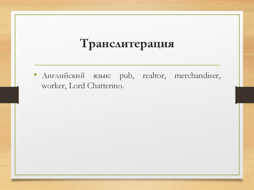 Транслитерация• Английский язык: pub, realtor, merchandiser,