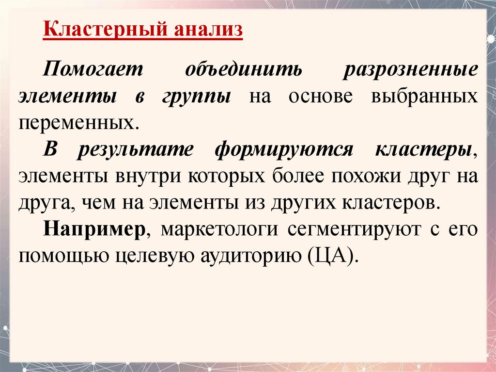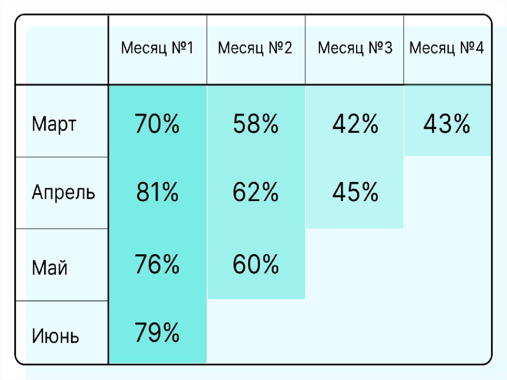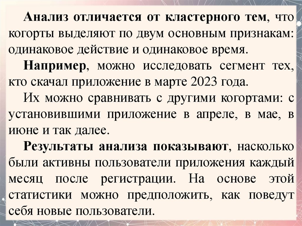 Анализ отличается от кластерного тем, чтокогорты выделяют по двум основным признакам: