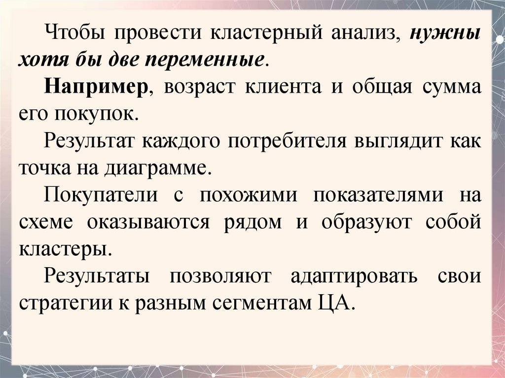Чтобы провести кластерный анализ, нужныхотя бы две переменные.