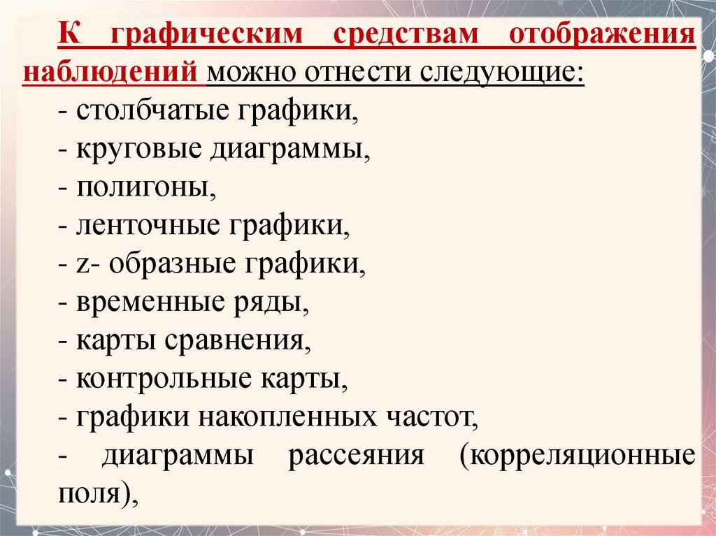 К графическим средствам отображениянаблюдений можно отнести следующие: