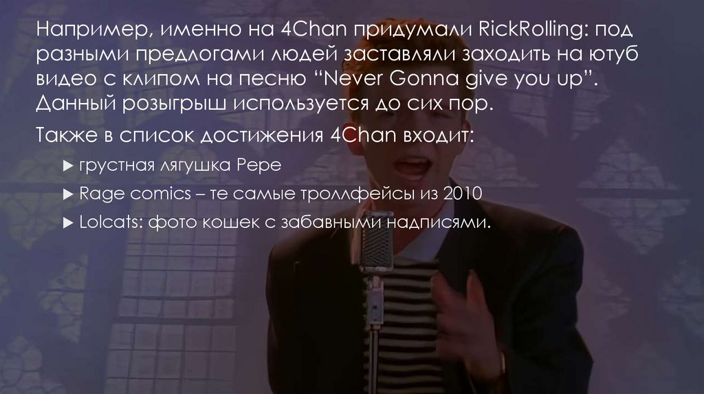 Например, именно на 4Chan придумали RickRolling: подразными предлогами людей заставляли заходить на ютуб