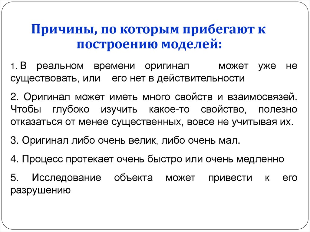 Причины, по которым прибегают кпостроению моделей: