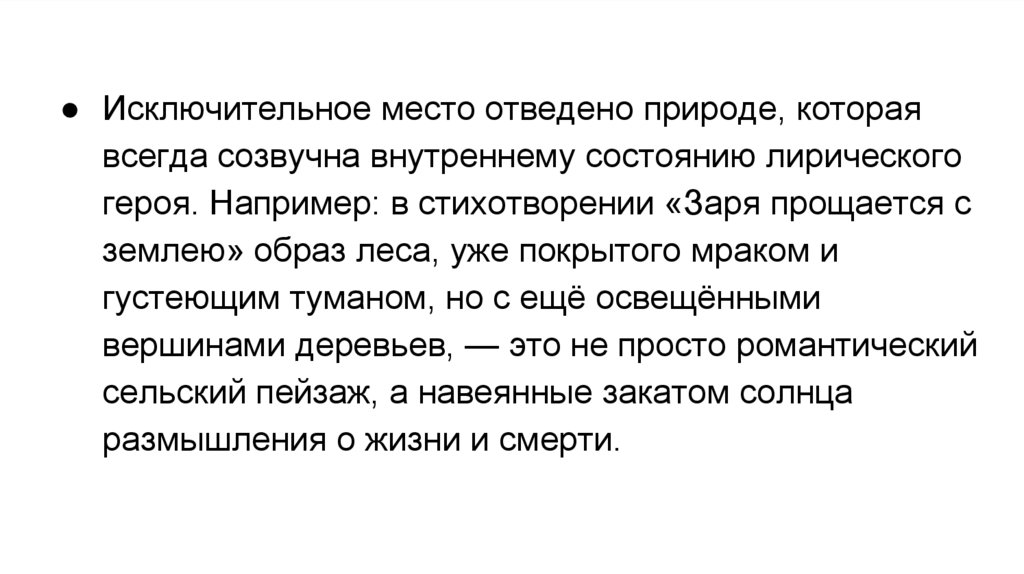 ● Исключительное место отведено природе, котораявсегда созвучна внутреннему состоянию лирического