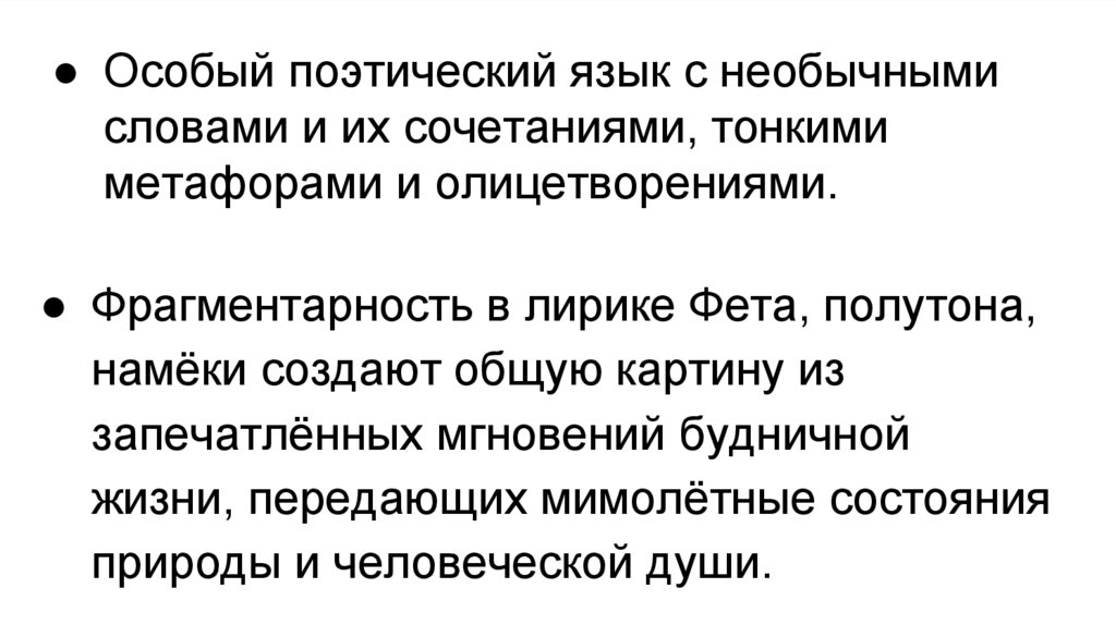 ● Особый поэтический язык с необычнымисловами и их сочетаниями, тонкими