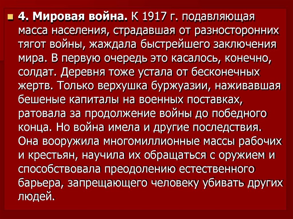 4. Мировая война. К 1917 г. подавляющаямасса населения, страдавшая от разносторонних