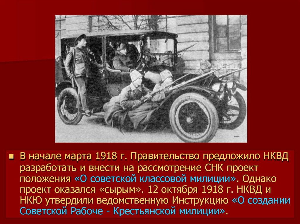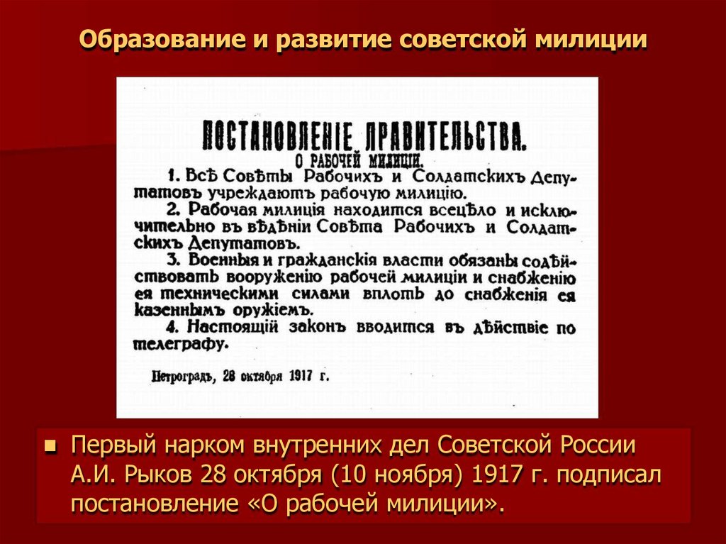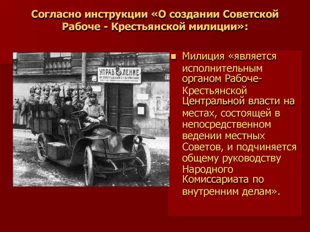 Согласно инструкции «О создании СоветскойРабоче - Крестьянской милиции»: