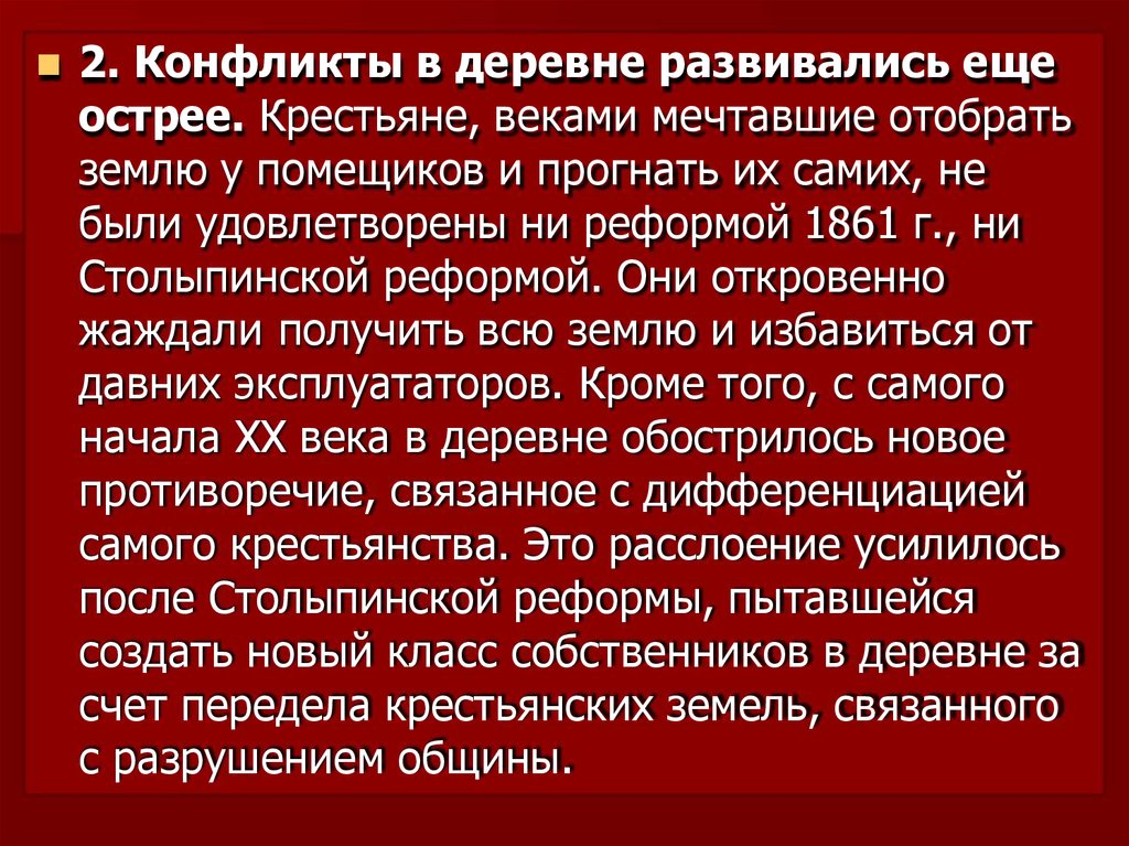 2. Конфликты в деревне развивались ещеострее. Крестьяне, веками мечтавшие отобрать