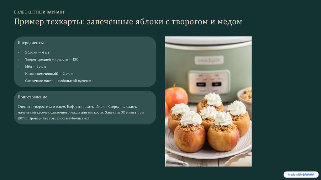 БОЛЕЕ СЫТНЫЙ ВАРИАНТПример техкарты: запечённые яблоки с творогом и мёдом