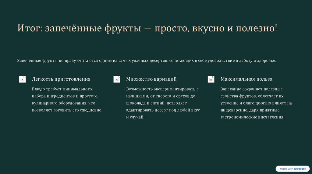 Итог: запечённые фрукты — просто, вкусно и полезно!Запечённые фрукты по праву считаются одним из самых удачных десертов, сочетающих в себе удовольствие и заботу о здоровье.