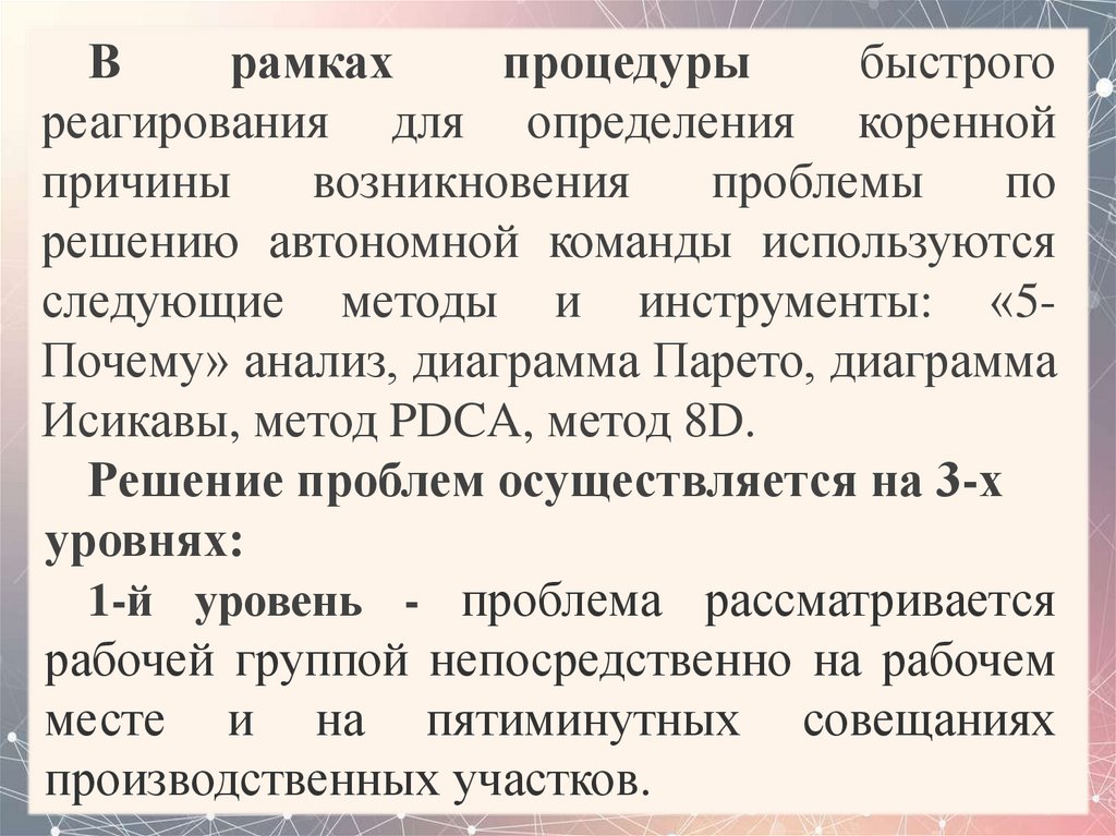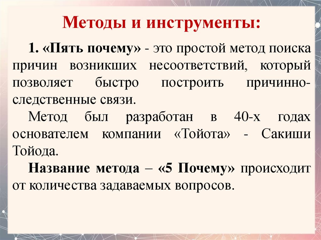 следующие методы и инструменты: «5Почему» анализ, диаграмма Парето, диаграмма