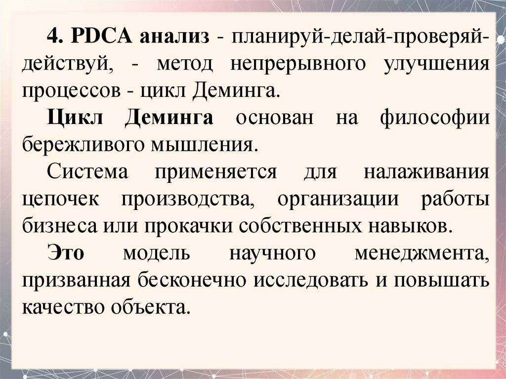 4. PDCA анализ - планируй-делай-проверяйдействуй, - метод непрерывного улучшенияпроцессов - цикл Деминга.