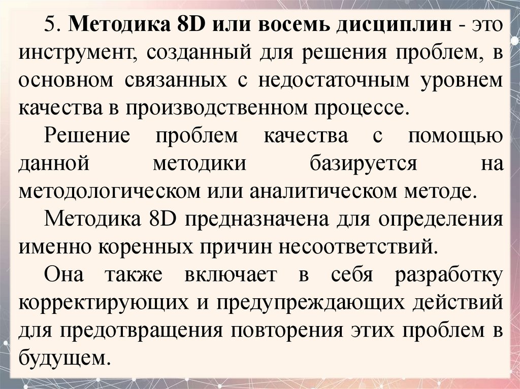 5. Методика 8D или восемь дисциплин - этоинструмент, созданный для решения проблем, в