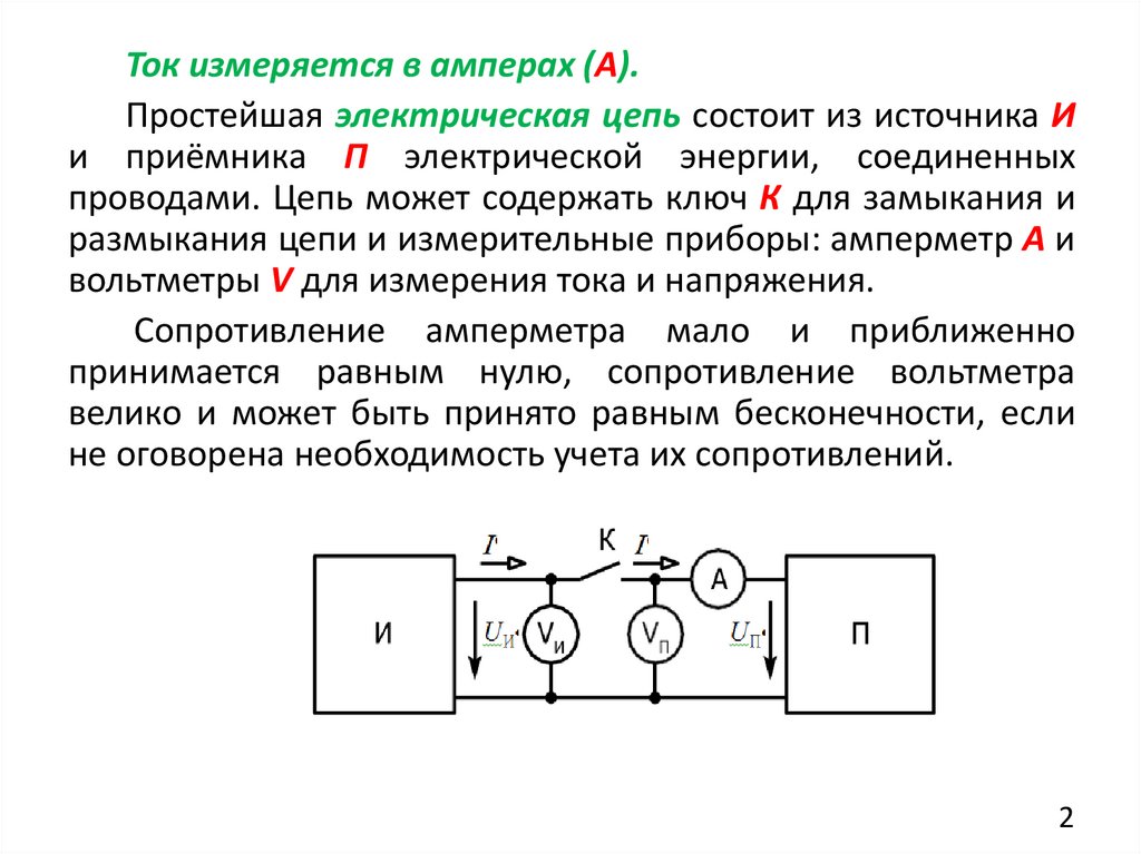 Ток измеряется в амперах (А).Простейшая электрическая цепь состоит из источника И